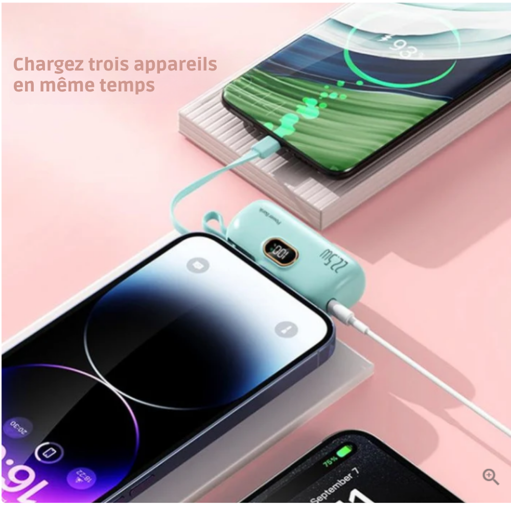 Le MiniCharge Duo™ se distingue par son format ultra-compact et sa capacité de recharge rapide, parfait pour ceux qui recherchent une solution efficace et esthétique.