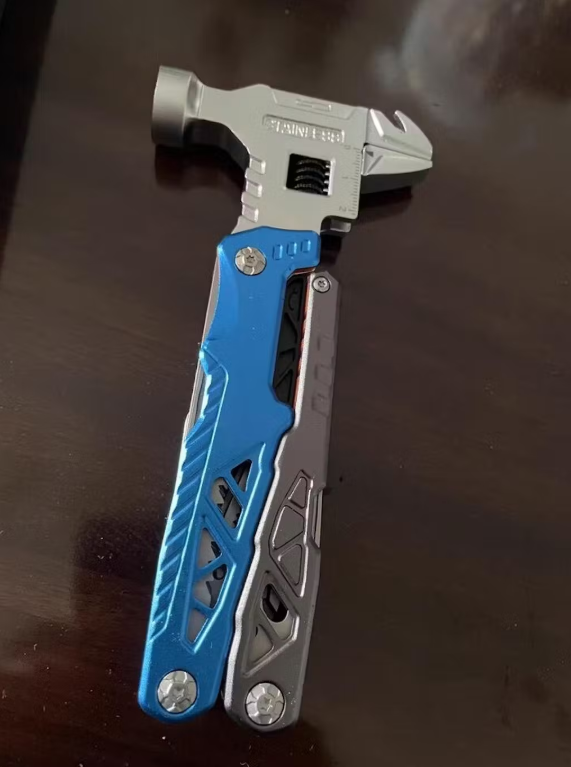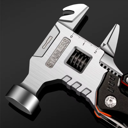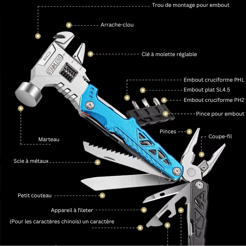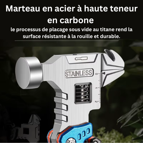 18 outils en un seul : Clé à molette, marteau, pinces, tournevis, scie, ouvre-bouteilles et bien plus.
